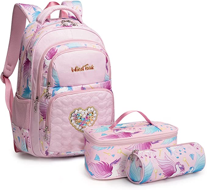 Wind took Kids School Backpack for Girls Elementary Student Bags with Insulated Lunch Bag Pencil Case 3 in 1 Bookbags