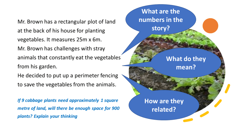For the second read, the problem is again presented to the students, but this time it includes the numbers. Read the problem again whole class. The questions you will ask now are all related to the numbers in the story. Our goal is for the students to understand that it’s not just 25m X 6m, it’s length of garden equal 25m and width of garden equal 6m. Students might also offer a relationship —e.g., Mr. Brown’s garden is 25m long and 6m wide.