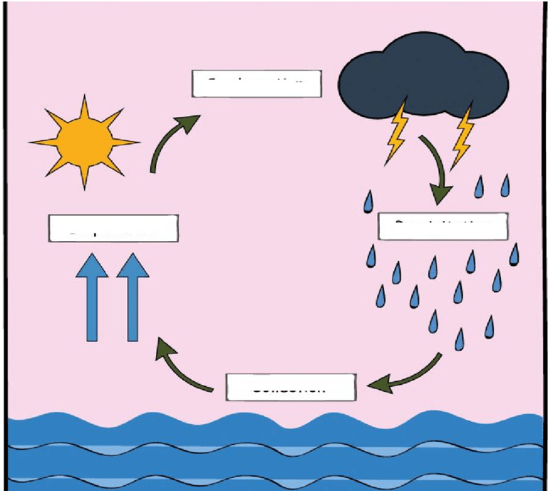9. Observe the diagram of the water cycle below and use the words to label it. ( 4 marks)