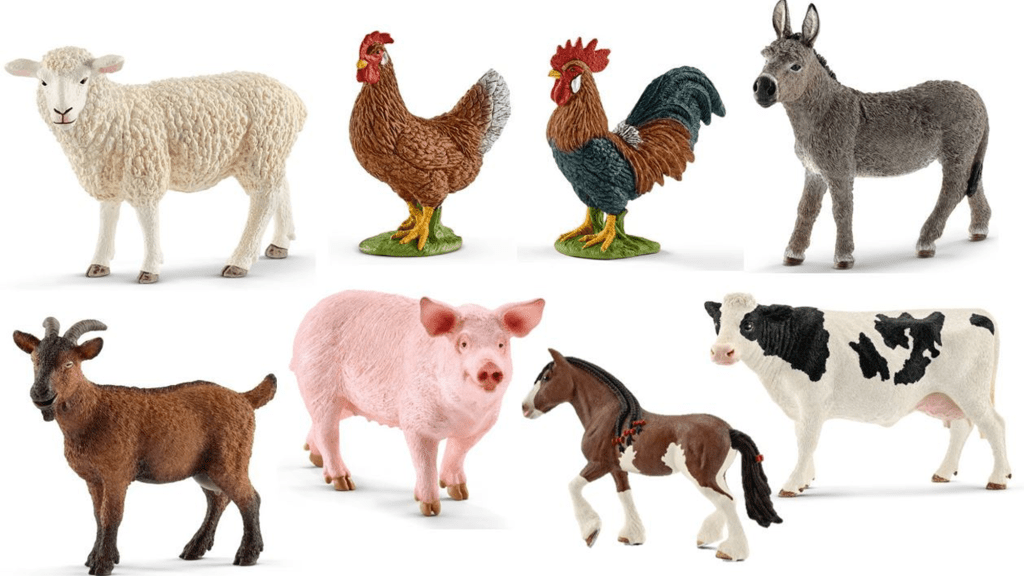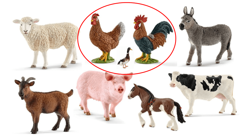A set of farm animals = {sheep, goat, pigs, horse, cow, donkey, chicken, rooster}