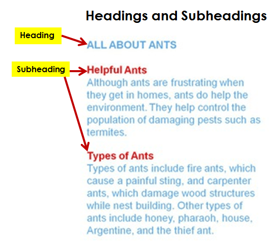 These are titles or labels that indicate the main topics or sections within a text. They help readers identify key points and navigate the structure of the text.