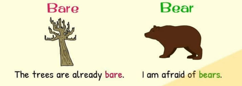 • Bear: A large mammal or to carry (e.g., “I saw a bear in the zoo.” or “He will bear the burden.”)